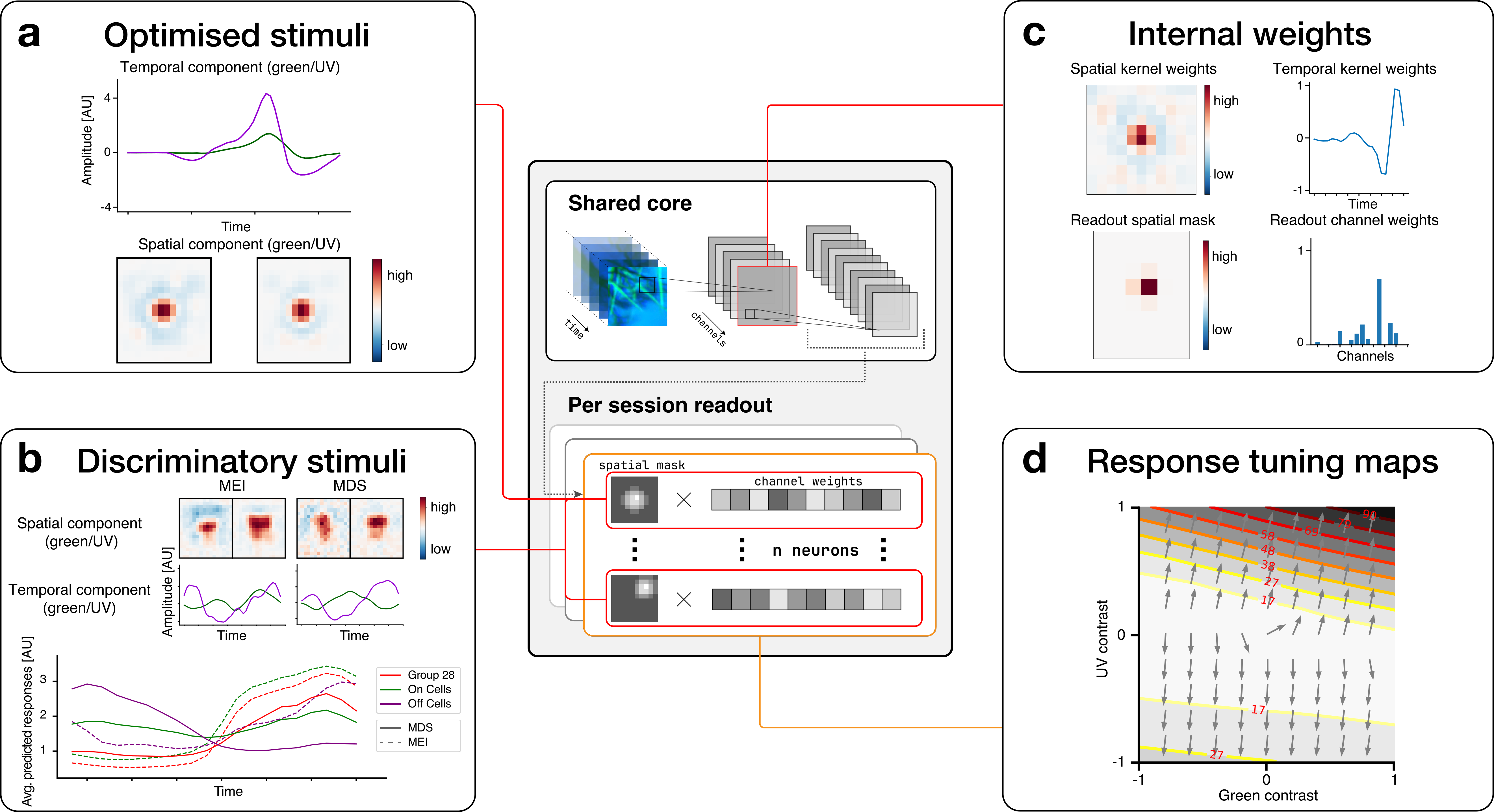 c) Internal weights (Page): By zooming in and visualising individual model weights, we can better understand how the neural network reproduces the behaviour of the retina. The upper part of the panel shows a visualisation of the spatial and temporal weights of a three-dimensional convolutional layer. The lower part of the panel shows the readout mask, which determines which spatial location in the stimulus influences a modelled neuron, and the readout channel weights that determine the influence of each convolutional channel on the modelled neuron.